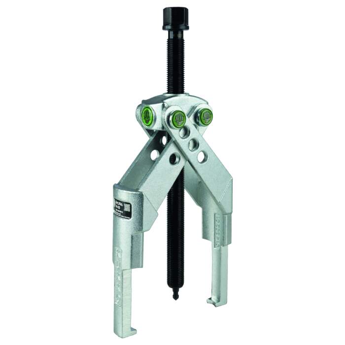 The 2-arm puller with self-clamping, intersecting puller legs is used for pulling off pinions, pulleys, bearings and similar components for narrow spaces. Self-locking retaining pins guarantee quick and easy adjustment for variable clamping ranges.