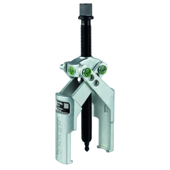 The 2-arm puller with self-clamping, intersecting puller legs is used for pulling off pinions, pulleys, bearings and similar components for narrow spaces. Self-locking retaining pins guarantee quick and easy adjustment for variable clamping ranges.