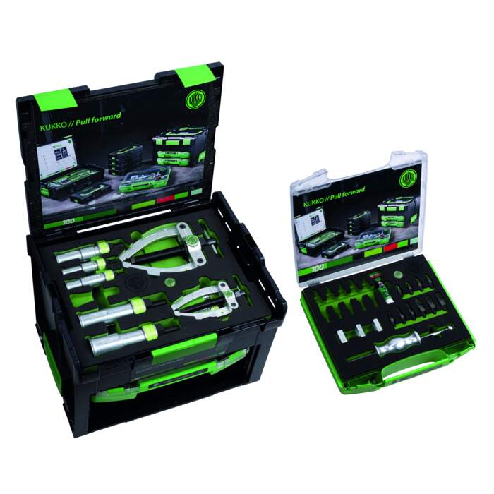 The slide hammer sets for extracting ball bearings and dowel pins of the 28 series are used for non-contact extraction of internal bearings, bearing outer rings and bushes as well as components with threads. For the application, counter support, slide hammer and thread inserts are included in the set.