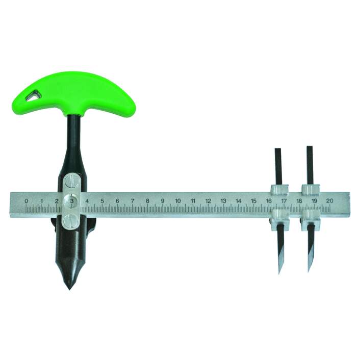 The disc cutter with two knives is used for cutting discs and sealing rings made of rubber, leather, paper, pressboard and plastic. The two sharp cutting blades are guided on a rail that can be aligned with millimetre precision.