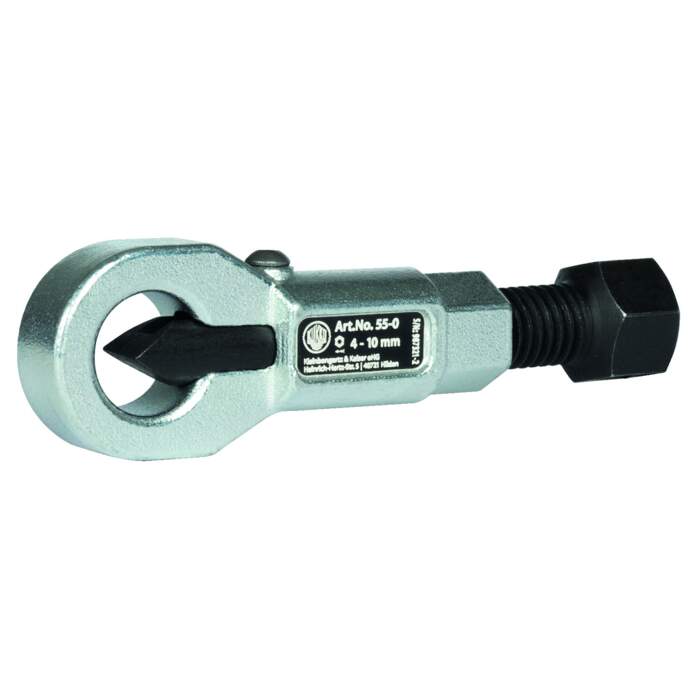 The single-edged, mechanical nut blaster is used to blast stuck, rusted or over-tightened grade 6 nuts. The cutting edge of the chisel, which is sharp due to a facet grind, penetrates deep into the nut when the spindle is tightened until it is blasted.