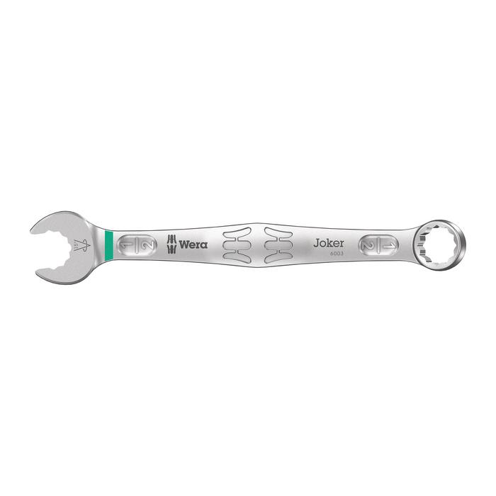As the installation space becomes increasingly tight during screwdriving, it remains necessary that tools enable users to work successfully. Narrow spaces require additional placement points of the tool. Can spanners be modified so that the placement possibilities of the tool increase? The combination of the 7.5° pivoted mouth and the double hexagon geometry doubles the placement points. A repeated 180° turn of the wrench around the longitudinal axis during screwdriving provides four placement possibilities, and bolts or screw heads can be "taken" every 15°. The Joker 6003 with its smart mouth geometry significantly expands the range of uses in confined spaces. The Joker 6003 will automatically find the respective placement point after every turn. The slim yet robust ring side is angled by 15° to the tool axis. The high-quality surface treatment achieves a high and long-lasting corrosion protection. With Take it easy tool finder: colour coding by size.