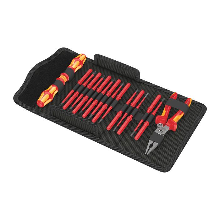 17-piece set 2 Kraftform handles 817 VDE for Wera VDE interchangeable blades only 14 VDE interchangeable blades (each 154 mm long) with reduced blade diameter (articles KK 60 i 0,4x2,5 and KK 67 i TX 10 conventional diameter) with integrated protective insulation, allows sunken screws and spring elements to be accessed and actuated 1 pair of Knipex electrical installation pliers VDE 13 96 200; for cutting, stripping, gripping, bending, deburring and crimping. With pawl for gentle gripping. Chrome-plated for better rust protection, with insulated multi-component grip sheaths.