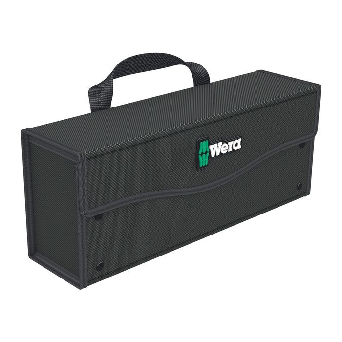 1 dimensionally stable and robust Tool Box, empty, equipped with handle for the storage and transport of tools and small parts; high resistance against cuts and stabs; comes with hook and loop fastener zone for docking with the Wera 2go system.