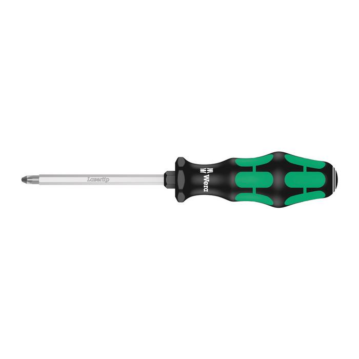 High quality Kraftform Plus screwdriver by Wera. Hard gripping zones for high working speeds whereas soft zones ensure high torque transfer for fast and low-fatigue working. The tips of Wera Lasertip screwdrivers are microscopically roughened by means of laser beams. This rough surface literally bites into the head of the screw. Any unintentional slipping out is therefore a thing of the past. More torque can be transferred with the help of an open-end or ring spanner applied to the hexagonal blade and integrated bolster. âTake it easy" tool finder with colour coding according to profiles and size stamp - for simple and rapid accessing of the required tool. The hexagonal non-roll feature prevents any rolling away at the workplace.