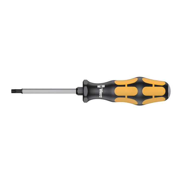 Application: TORX® socket screws Blade: Hexagonal throughout with impact cap, hexagonal bolster Design: Chrome-plated, Black Point Handle: Kraftform with non-roll feature, multi-component