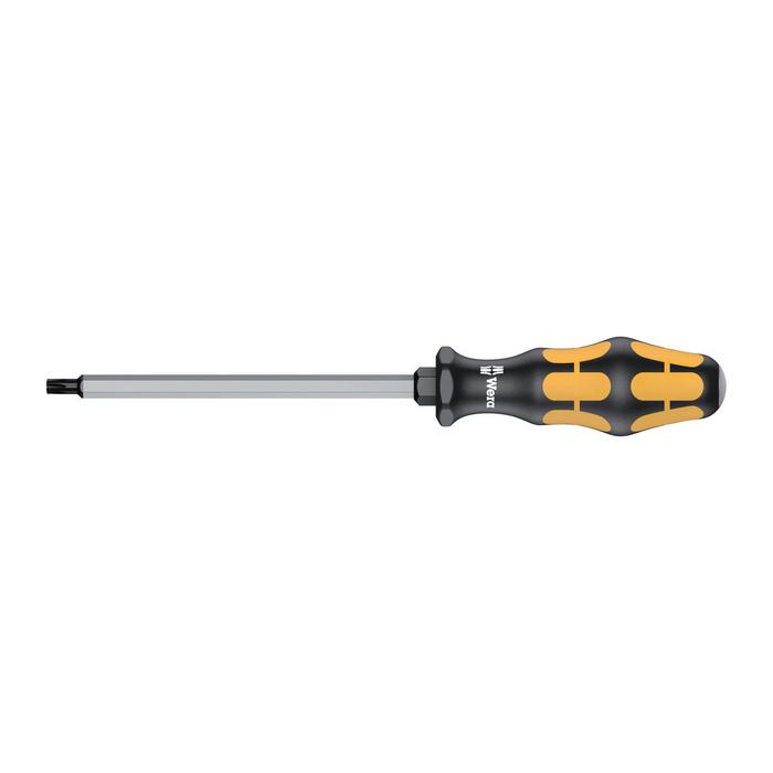 Application: TORX® socket screws Blade: Hexagonal throughout with impact cap, hexagonal bolster Design: Chrome-plated, Black Point Handle: Kraftform with non-roll feature, multi-component