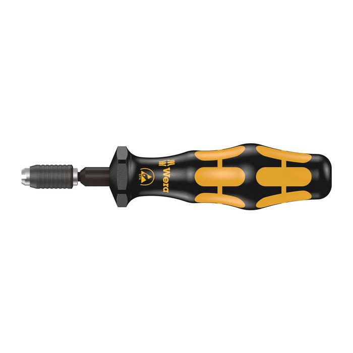 Wera torque screwdriver. Secure protection against electrostatic charge and associated damage. Comes with pre-set torque value for all applications where the same, constant torque and repeat accuracy are required. The torque value can be modified within a specific measurement range. Rapidaptor quick-release technology for rapid bit change. Unlimited torque to loosen seized screws. Multi-component Kraftform handle with hard and soft zones for high working speeds, whilst being easy on the hand. Suitable for bits with 4 mm Halfmoon drive (and Wera Serie 9) and 4 mm HIOS drive (and Wera Series 21).