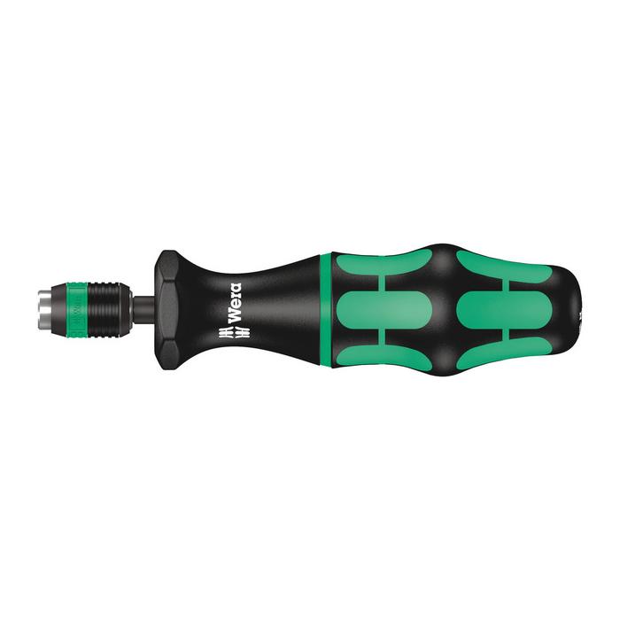 Application: Suitable for 1/4" DIN ISO 1173-C 6.3 and E 6.3 hexagon insert bits and Wera Series 1 and 4 Design: Rapidaptor rapid-in, rapid-out, rapid-spin, chuck-all and single-hand technology Pre-set torque: 2.5 in.lbs., 11.0 in.lbs. Accuracy: ±6 % (DIN EN ISO 6789). Reliable slipping mechanism and acoustic signal when reaching the set torque. Handle: Kraftform with non-roll feature, multi-component