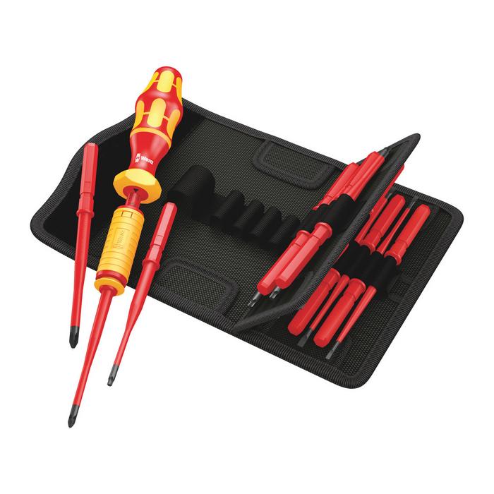 1 Series 7400 VDE Kraftform adjustable torque handle (1.2 - 3.0 Nm) for Wera VDE interchangeable blades only VDE interchangeable blades (each 154 mm long) with reduced blade diameter (articles KK 60 i 0,4x2,5 and KK 67 i TX 10 conventional diameter) with integrated protective insulation, allows sunken screws and spring elements to be accessed and actuated 15-piece set