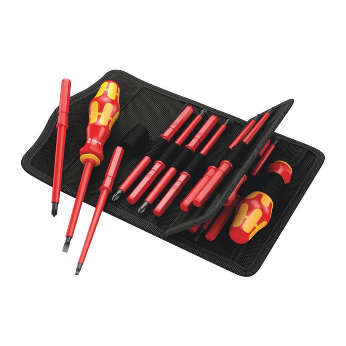 16 VDE interchangeable blades with 2 817 VDE Kraftform holders in a robust belt pouch. Individually tested tools as per IEC 60900. Individual testing in a water bath at 10,000 volts so as to ensure safe working at the permitted voltage of 1,000 volts.